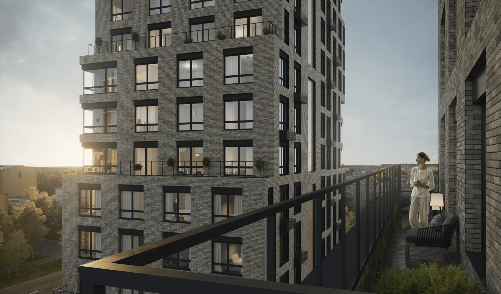 Городской угол на широком проспекте фиксирует симметричная композиция из двух 15-ти этажных секций.